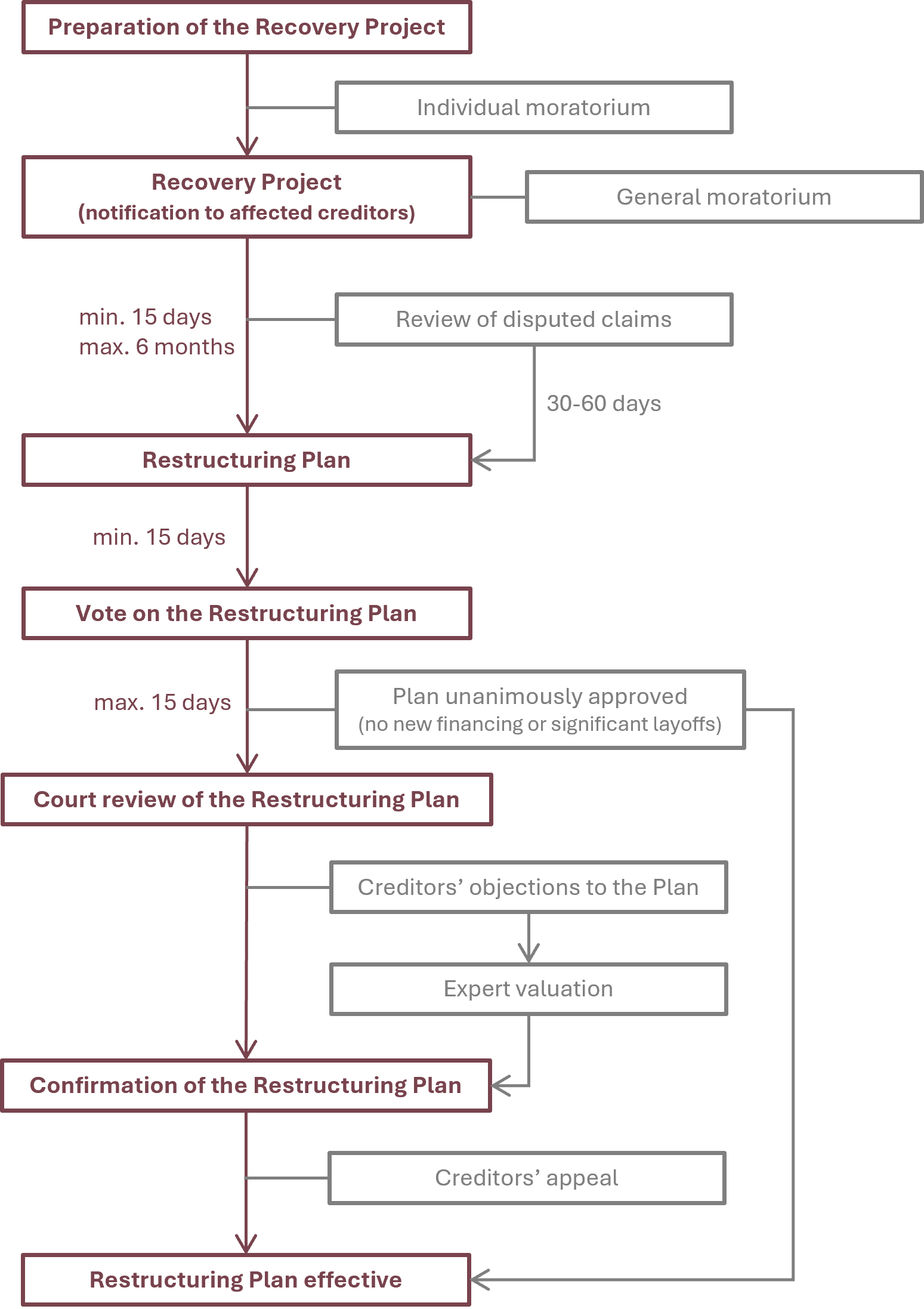 The Company prepares a recovery project describing its economic situation, ownership structure, assets and liabilities, identifying the main causes of financial distress and setting out restructuring measures. The Company specifies the affected creditors and the intended effect on their rights.