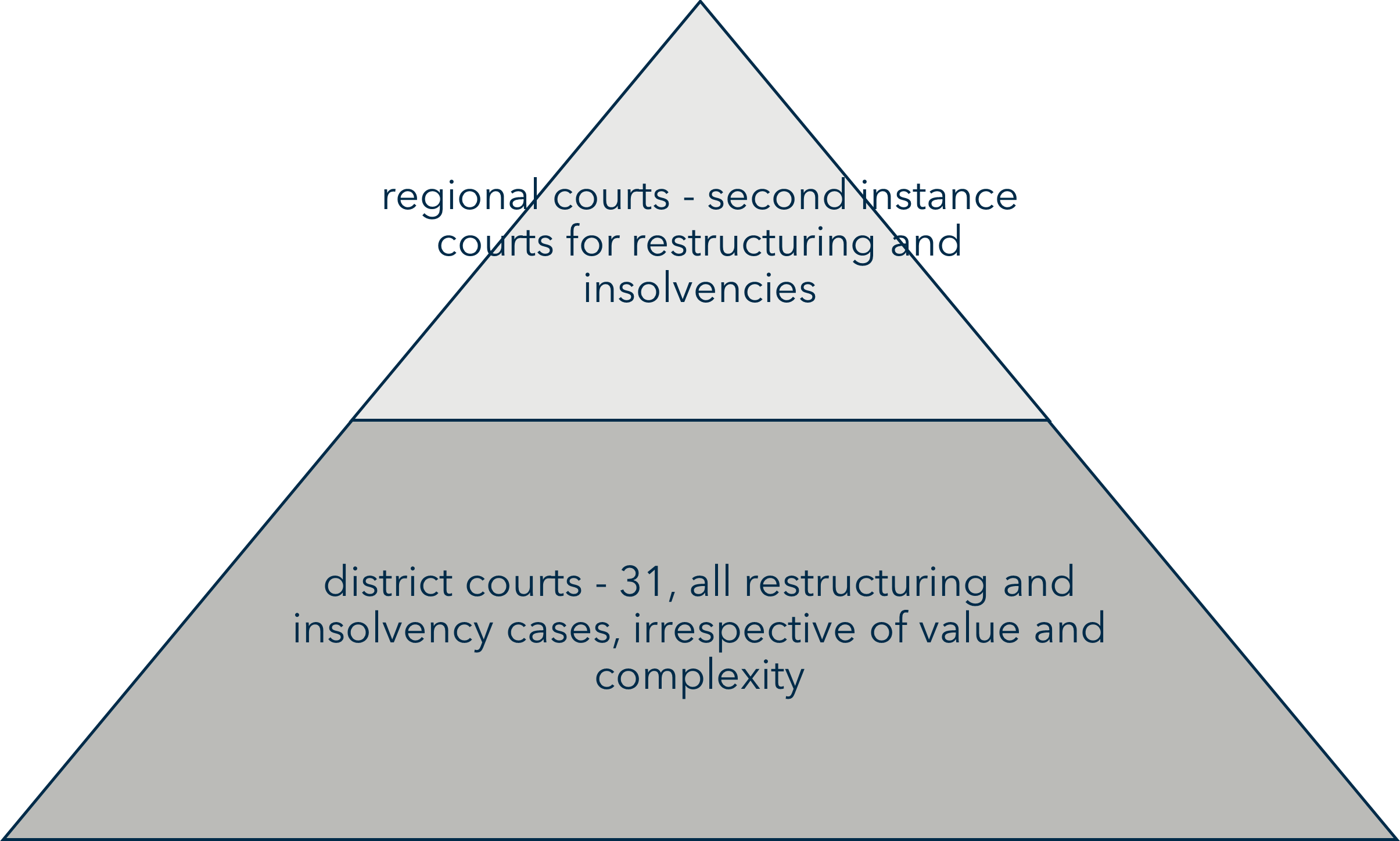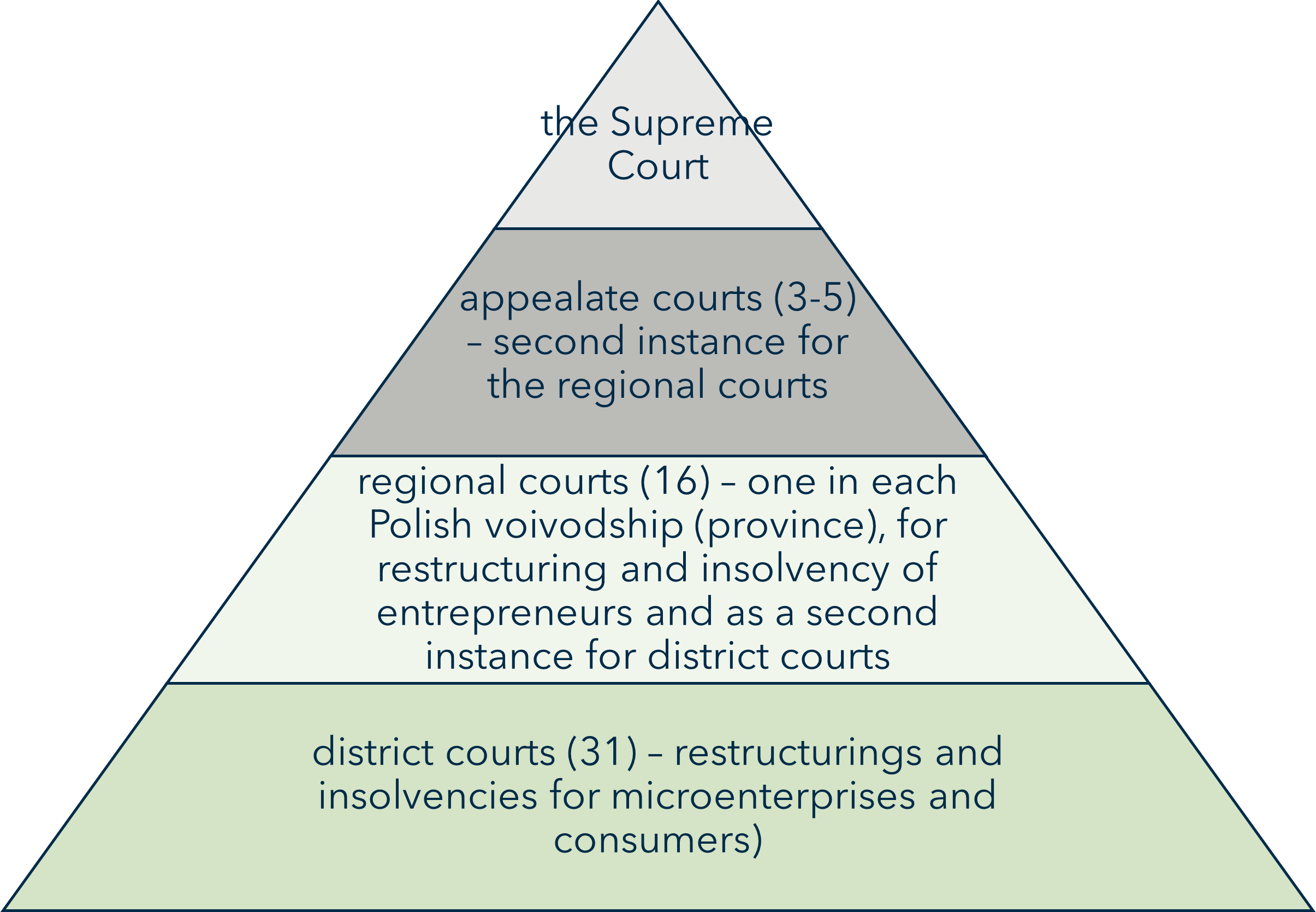 Nowadays, first instance bankruptcy and restructuring cases are processed in district courts (sądy rejonowe), which are the lowest level of Polish courts, irrespective of the value of the case and its complexity. Therefore, a first-instance judge has to deal with both complex restructuring cases valued at billions of Polish zloty and simple consumer bankruptcy cases of relatively small value. The workload is overwhelming. First-instance judges are dealing with approximately 200 consumer bankruptcy cases and ten corporate restructuring cases at the same time – an untenable work load.