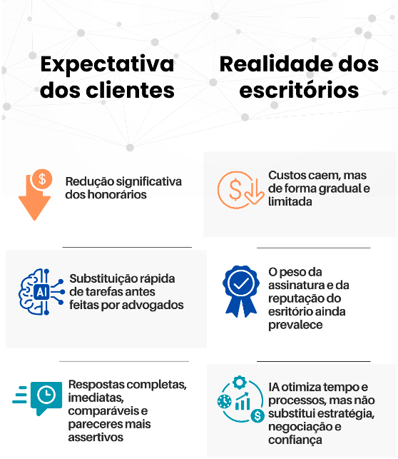 A análise revela um ponto de convergência: escritórios e clientes já reconhecem a IA como realidade. A discussão vai além da simples redução de honorários e se concentra em como agregar valor em um cenário em que parte das tarefas pode ser realizada por algoritmos.