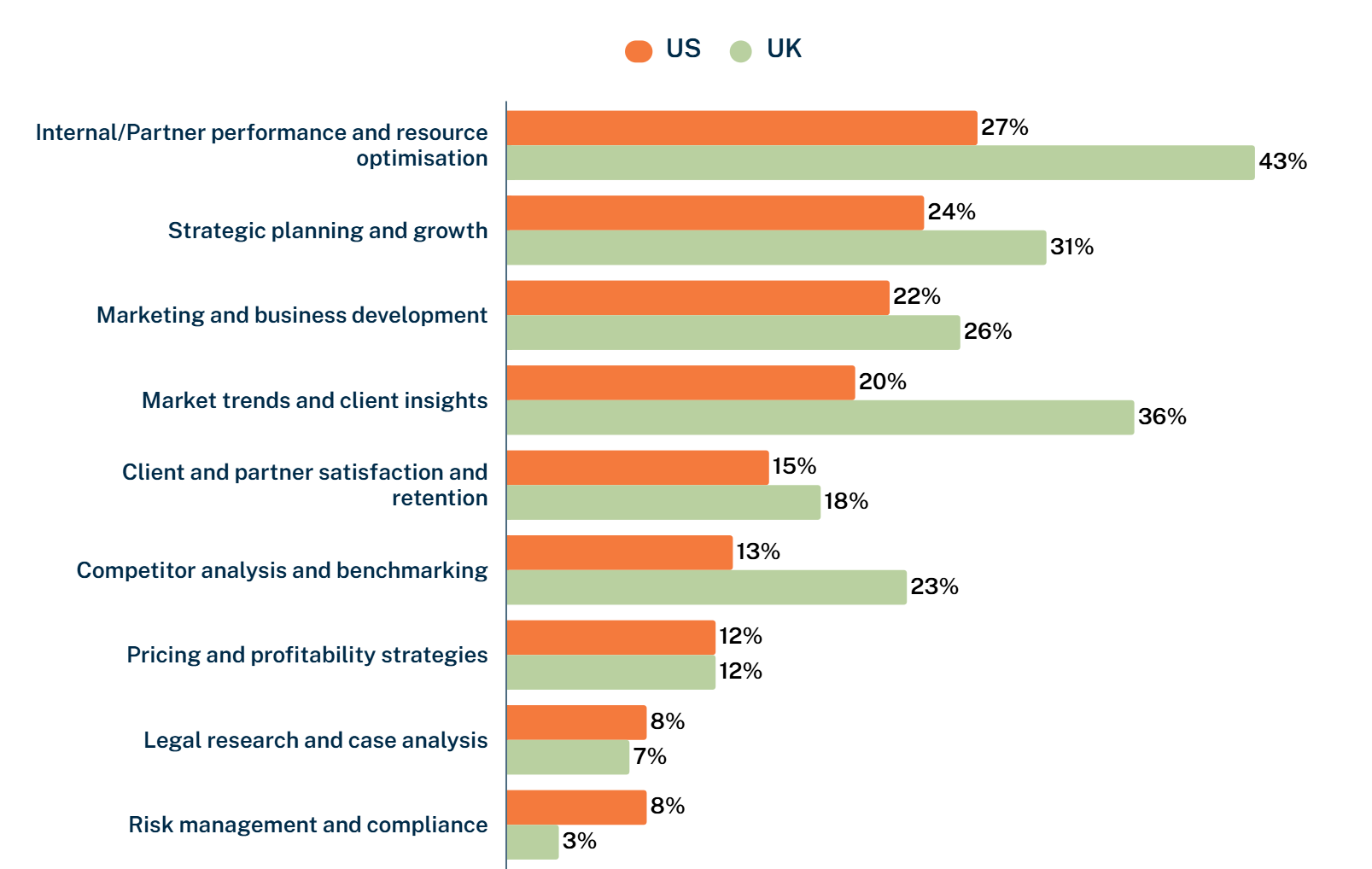 UK law firms show a different pattern. Internal and partner performance optimisation leads by a significant margin at 43% – substantially higher than the US figure of 27%.